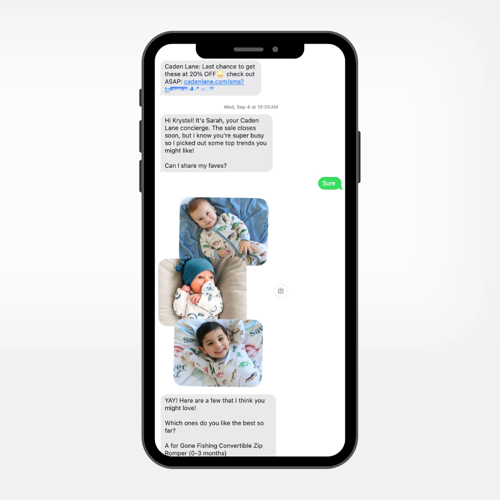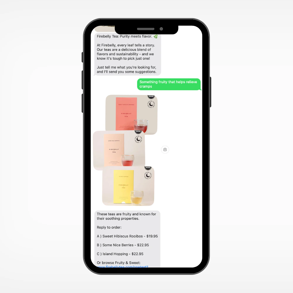 At OneText, we know that quizzes are not just fun—they’re a powerful tool for engagement. Our AI takes quizzes to the next level by anticipating shopper product preferences and checking your inventory for available variants in real-time. When customers interact with the quiz, our AI asks pointed follow-up questions to refine their decisions and ensure they find exactly what they are looking for. Once the selection process is complete, our AI facilitates a seamless transition to payment, using our text to buy magic.Example