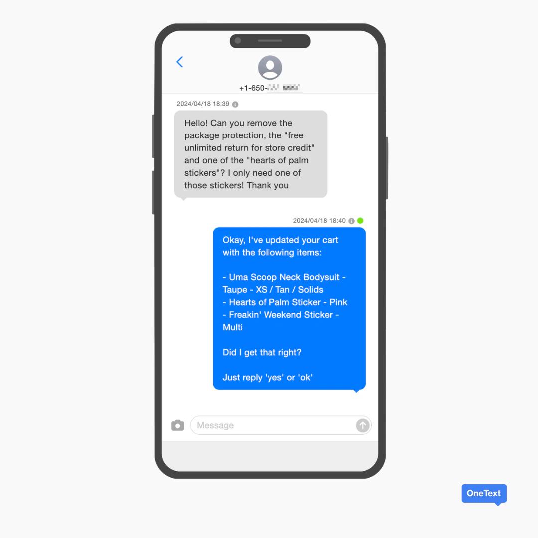 Our AI helps manage shopping carts with unprecedented intelligence. With the ability to add, remove, or modify items based on customer input, our AI minimizes the need for manual cart adjustments (if needed, our live agents are always here to help!). This not only makes customers happier, but also helps them buy faster.Example